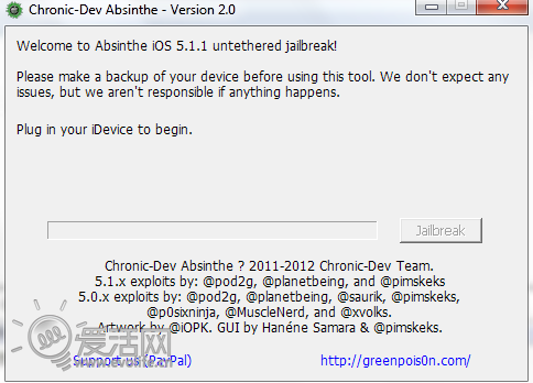 越狱这个词近段时间似乎成为了历史,在果粉们在苦苦等待了数月之后,如今终于可以放心的升级越狱感受iOS自由了。今晚八点三十分,国外的越狱大神Pod2g如约的放出了iOS 5.1.1完美越狱工具——Absinthe 2.0。