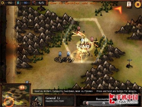 游戏在操作方面,也充分考虑了手指操作,废弃了鼠标上的圈地方式,而改用了画圈圈的方式,与游戏的风格相得益彰。游戏是以部队为单位的,同时兵种之间也有相克一说,在战斗时我们也要充分考虑到兵种相克的因素,以优势兵种来磕敌人的软肋。