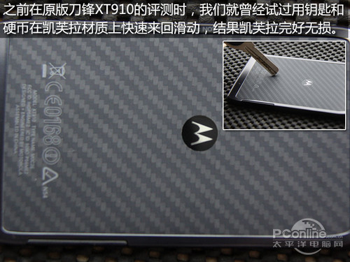 目前,手机的外壳材质主要有塑料、玻璃、金属三种。然而,摩托罗拉XT910 MAXX却是个例外。尽管不是三防手机,但防刮效果却是一流的。一方面,康宁Gorilla玻璃屏幕可以抵御正面入侵;另一方面,背面的凯芙拉材质外壳则具有很强的“抗打击能力”。不可更换电池的一体化设计对于一款配备了超大容量电池的手机来说不成问题,一般使用情况下的待机时间可以达到2天以上。