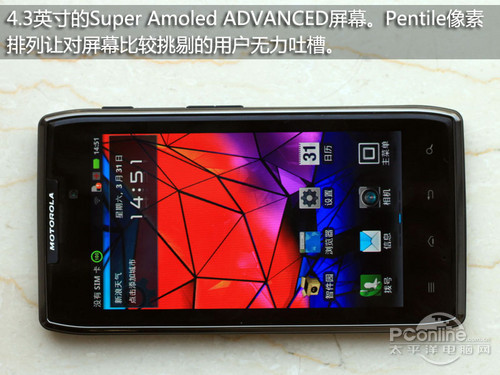 在屏幕配置方面,摩托罗拉XT910 MAXX采用了可视面积为4.3英寸的Super AMOLED ADVANCED高清屏幕,为高质量的显示效果提供了保障。但Pentile像素排列方式在显示文字等信息时,虽然会有偏色的存在,不过颗粒感不严重。