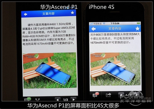 4.3寸的大屏的P1要比3.5寸屏的iPhone大很多