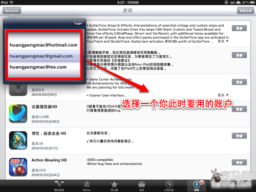 AccountChanger可以记录您已登录过的apple id,允许您在app store浏览软件的时候想切换apple id无需打开设置-store注销 再登录,只需点击app store下的“更新”再点击左上角的“Accounts”切换即可。