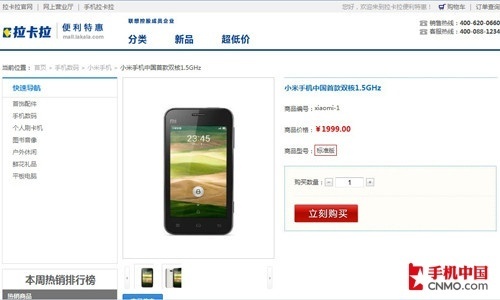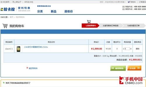 整个购物并非都是在手机端完成,笔者是通过电脑填写订单,在手机端进行支付。首先使用电脑访问http://mall.lakala.com /,通过点击明显的小米广告进入产品页面并“立即购买”,这时购物车中已经有相应的内容,如果不再想买别的商品就可以直接去结算了。