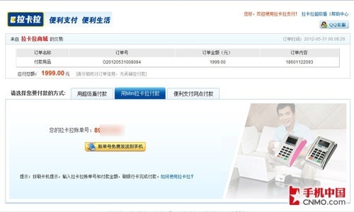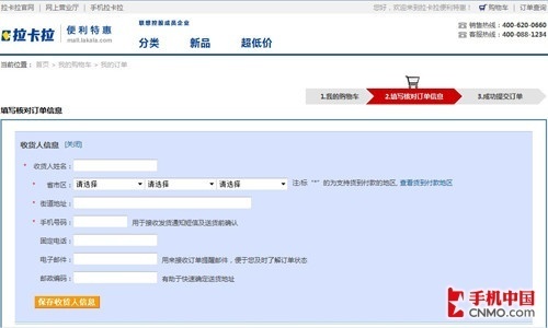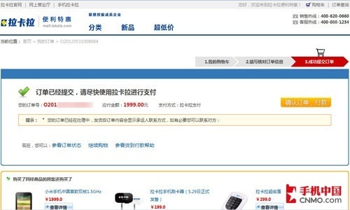 结算需要经过两个步骤,即填写核对订单信息、提交订单,其中填写核对订单信息就是填入收货人信息、配送信息等并核对。点击提交订单后即到达“成 功提交订单”阶段,点击“确认订单,付款”按钮。这时就会弹出与拉卡拉相关的支付页面了,点击“用Mini拉卡拉付款”或者“便利支付网点付款”都会看到 一个相同的拉卡拉账单号,此号码便是我们在手机端进行支付的一把“钥匙”。