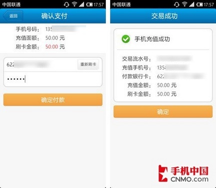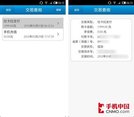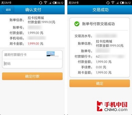 接下来就是支付过程了,用户操作需要两步刷卡、输入密码,一切准备就绪之后点击确定付款,此时交易成功界面显示手机充值成功,看来刷卡其实很简 单。除了查询和充值功能之外,其实拉卡拉还提供了诸如转账、汇款、还款等丰富的功能,在操作上有很大相似之处,在这里我们就不一一细讲。