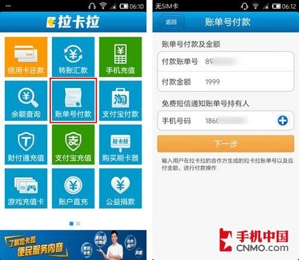 在手机上插入拉卡拉手机刷卡器,登录之后在主界面上点击“账单号付款”,在接下来的页面中填入刚才的拉卡拉账单号与付款金额,点击下一步。在确 认支付页面检查一下账单信息,如果无误就可以在刷卡器上直接刷卡并输入密码了。最后点击确定付款,至此交易成功,我们可以在“交易查询”中查看交易状态, 可以在电脑端通过订单号来查看订单状态。