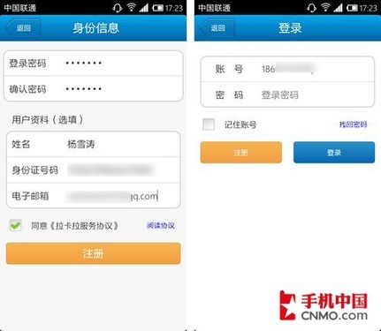 说到账户就肯定离不开密码,在“身份信息”界面中填出登录密码,选填用户资料,其中用户资料分别是姓名、身份证号码、电子邮箱。最后勾选同意《拉卡拉服务协议》并点击注册。注册后我们就可以使用刚才的手机号码和密码进行登录了。