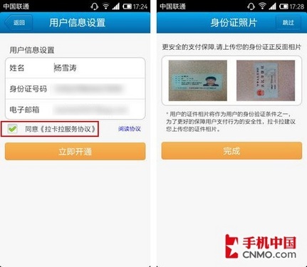 在使用之前,刷卡器还需要一个开通的过程。这需要用户在此进行用户信息设置,填入自己的姓名、身份证号以及邮箱,勾选选同意《拉卡拉服务协议》并点击立即开通。另外出于安全性考虑,建议每一个用户都进行身份证正反两面照片的上传。最后点击完成就大功告成了。