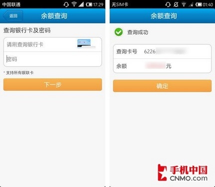 在卡槽的左侧或者右侧横向滑动刷卡,这时手机客户端上就显示了当前银行卡的卡号,接下来输入银行卡密码就可以成功登录当前银行卡账户了,而界面上显示出该账户余额数量。