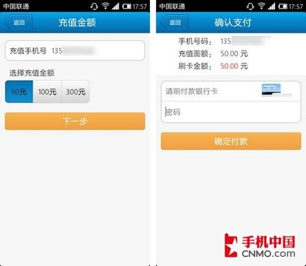 接下来我们再试用一下常用的手机充值功能。需要注意的是,笔者在使用上一功能之后退出了一次程序,当再次进入程序时需要进行重新登录拉卡拉账号。输入需要充值的手机号,并进行二次确认输入,之后用户可以选择50、100、300三种充值金额。