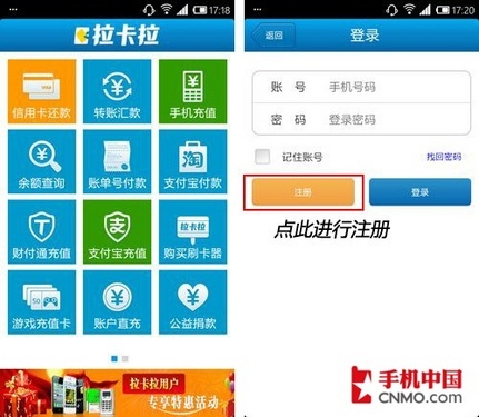 由于每一台刷卡器都是与唯一的账号进行绑定,所以在首次使用前需要进行注册,而注册方法也非常简单。启动拉卡拉客户端之后,任意点击主界面上的 一个图标都会提示进行登录,在这里我们选择注册。接下在需要用户输入自己常用是手机号码,此号码将成为刷卡器的登录账号。点击获取手机验证码,这时该号码 就会收到一条含有验证码的短信。在相应的空栏中输入验证码并点击提交。