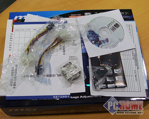 配件方面,随卡附送了2个4pin转6pin显卡独立供电转接线,1个DVI-VGA转接头,1个Mini-HDMI转HDMI转接头及产品说明书光盘驱动等配件。
