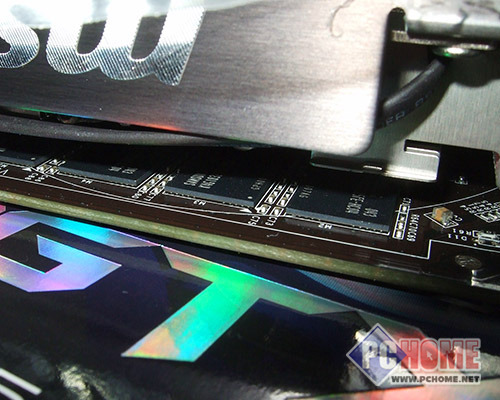 显存方面,微星N560GTX-Ti Twin Frozr II/OC版显卡采用三星制造的HC04 DDR5高速显存颗粒,组成了1024MB/256bit显存规格,默认频率高达4200MHz,我们可以看到此频率离显存设计的5000MHz还有一定 提升空间,玩家可通过微星自带超频软件将显存超频至4500MHz以上。