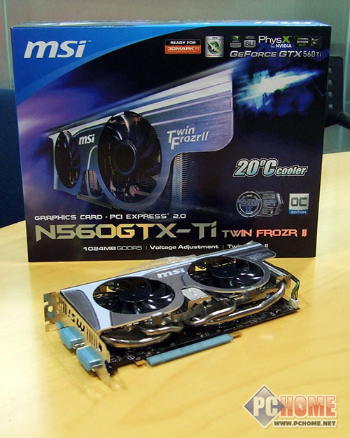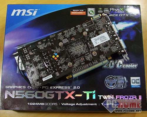 微星N560GTX-Ti Twin Frozr II/OC版显卡基于最新GF114-400-A1核心制造,采用40nm的工艺制程,核心晶体管数量高达19.5亿个,核心内置完整的384个CUDA 流处理器,56个纹理单元及32个光栅单元,默认核心频率为880MHz,略高于公版820MHz。该卡支持最新的DirectX 11与Shader Model 5.0,还支持NVIDIA自身特色的CUDA、PhysX物理加速、3D显示与3D眼镜支持以及PureVideo高清硬件加速技术。