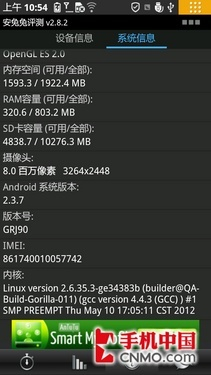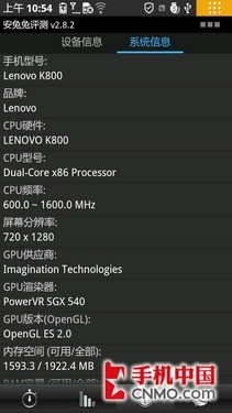 联想K800采用的英特尔Atom Z2460单核处理器,最大的特点就是采用了X86架构,主频为1.6GHz,但由于其超线程技术的原因所以安兔兔检测显示为双核心。
