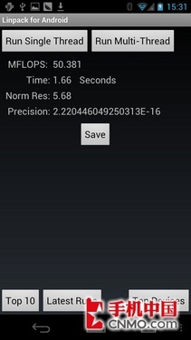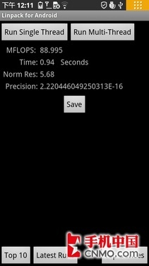 Linpack for Android是一款测试浮点运算能力的基准测试软件,通过计算密集型线性方程Ax=b来衡量智能手机的运行速度,结果中MFLOPS(每秒百万个浮点操作)=操作浮点数/(执行时间*10^6)(即10的6次方),而计算时间越少说明处理器性能越强。