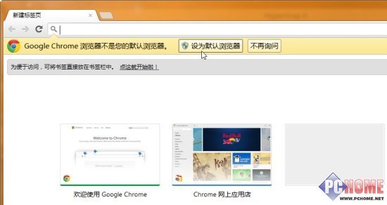 在桌面环境下正常安装完Chrome后,还不能直接在Metro环境下使用,需要将Chrome设置为系统默认的浏览器。在桌面下启动Chrome,会看到浏览器地址栏下方有一条Chrome不是默认浏览器的提示。
