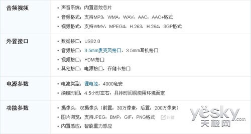 其他参数用来为大家提供参考,其中可以看到欧达P801W支持的视频格式有WMV、MPEG4以及3GP格式,虽然格式不多,但都为常用格式,相对实用。