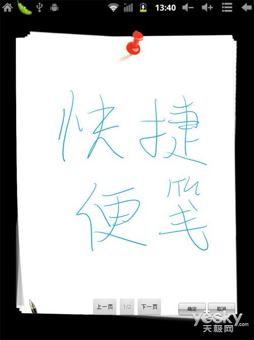 不仅界面不同,整体的操作也与以往大不一样,在主界面的最中间,我们看到一个巨大的便签,只要轻轻点击这里就可以打开便签,使用欧达P801W转配的电容笔就可以在这记录或者涂鸦,对于商务人士来说,重要性不言而喻。