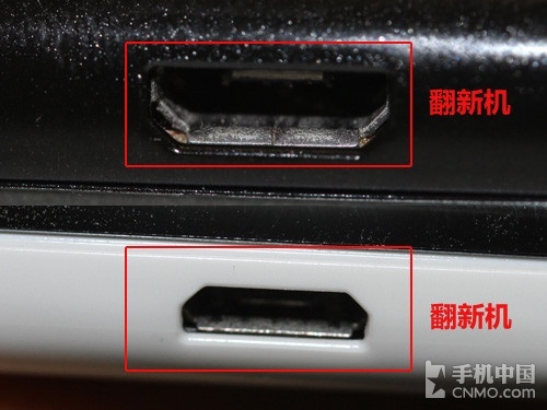 最后再来看一下USB接口,由于翻新机多采用二手旧主板,所以其内部会存在一定使用痕迹。上图中两部翻新机的USB接口内就有明显划痕,这正是长期充电造成的。同时,内部还留有许多灰尘及污渍,甚至出现轻微生锈的情况。一般来说,通过出厂日期和上述两点的鉴别,基本可以判断一部手机是否为翻新机,所以大家在购买时务必要自己检查,以免上当受骗。