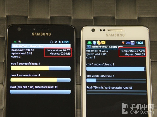 从上图可以看出,随着时间的推移,两部手机的温度不断升高,黑色机器温度已达到46℃,而白色机器则为37℃。之前在网上也有不少用户反映,手机在升级到Android 4.0之后出现明显发热问题,通过上面的测试也可以看出区别。