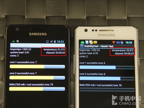两部测试手机均为欧版I9100,黑色机器系统为Android 4.0,白色机器系统为Android 2.3。两机刚开始时温度正常,且相差不大,分别为31℃和34℃。