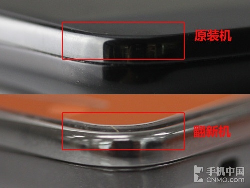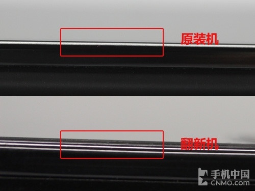 两边的屏幕也是如此,原装机的屏幕四周与边框贴合十分紧密,并且处于同一条水平线,几乎没有缝隙和翘起的现象,整块屏幕也与边框平行,没有出现错位的情况。而翻新机的做工就要差很多,其屏幕四周并未与边框贴合在一起,且不处于同一条水平线,缝隙明显,整块屏幕都要高出边框1毫米,这正是翻新机手工装配所暴露出的问题。