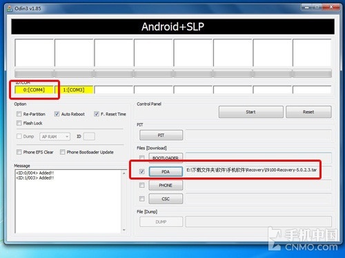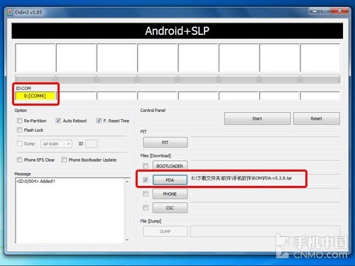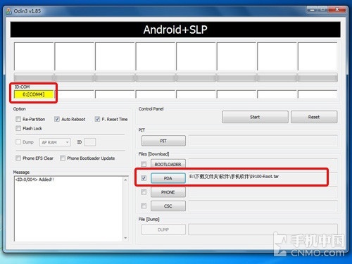 与刷Recovery一样,ROOT同样需要用到Odin3,步骤十分相似。将手机关机后调至刷机界面,连接电脑后打开Odin3,在PDA处导入ROOT文件,点击Start开始。