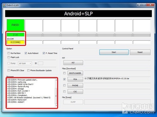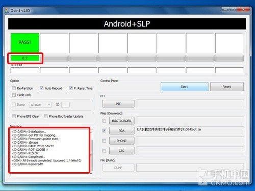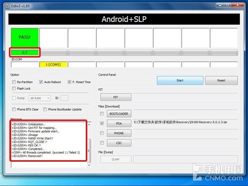 由于Recovery文件只有6MB,所以整个刷入时间极短,只需要7秒钟。成功后红框圈住部分变为绿色,上方显示PASS,下方的对话框也会有刷新结束的提示。