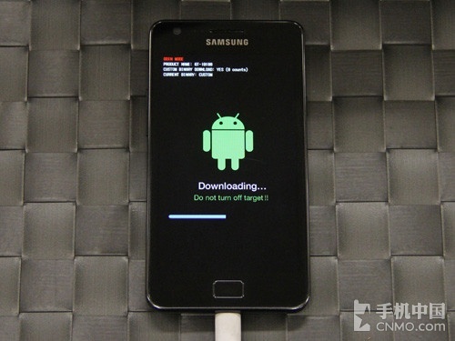 此时,断开手机与电脑的连接,将手机完全关机(可以直接扣电池然后再装上),按住Home键和音量上键不松手,然后再按住开机键,直到出现上图所示画面再松手。