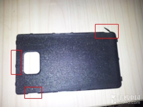 长时间以来,三星I9100的材质都饱受诟病,整机采用塑料外壳,手感并不是很好,过轻的机身即使装上电池也没有太大改观。还有就是后盖,采用了多卡扣设计,虽说不容易松动,但无论开启还是闭合都比较麻烦,得把卡扣逐一按下,有时漏按一个还得重新来过。相对来说开启还比较方便,但却存在着将后盖掰裂的可能,上图中的后盖右下侧已断裂,一块小塑料板也掉了下来。而摄像头两侧红框标注的位置也比较容易裂开,所以大家在使用时要多多注意。