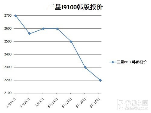 一般来说,韩版水货机的价格都要低于欧版很多,I9100也是如此。从上图来看,韩版I9100在四月初就已跌破3000元大关,之后虽有短暂反弹,但总体仍呈现降价态势,在跌破2500元之后更是一发不可收拾,一路降至2199元。由于比欧版便宜300多元,所以它也将早于前者跌破2000元关口,相信在暑期学生购机潮来临之时就可以实现。