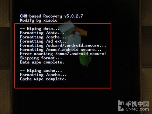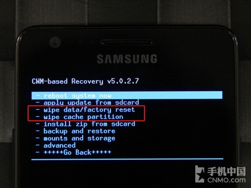 关机后进入Recovery,分别执行红框圈住的两个选项,即双Wipe,这样做的目的是将系统缓存清理干净,以免出现刷机失败的情况。当然,并不是所有ROM都需要双wipe,甚至有些ROM不能进行双wipe,否则会造成刷机失败,这些就需要大家在下载ROM时多关注一下作者的说明,以免操作不当造成损失。