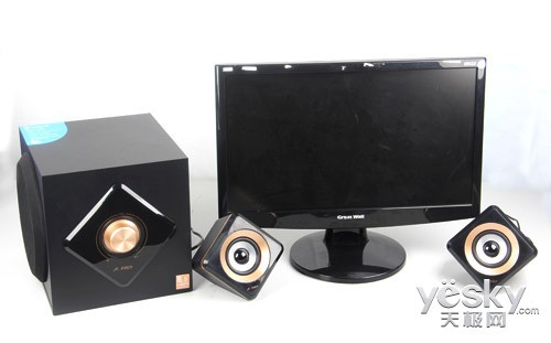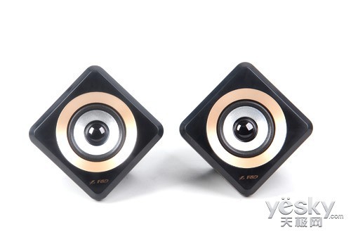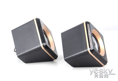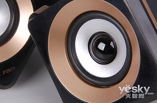 两个卫星箱外形像立放的菱形立方体,带来不规则放置的空间感。卫星箱的喇叭单元从内到外、由中心黑色防尘帽向外呈三维立体式展开,黑、银、金的交替使其层次感明显。