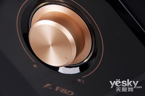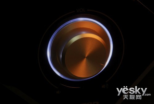 低音炮前面板上超大的金色音量旋钮相当显眼,旋钮上散射开来的太阳纹设计极具质感。旋钮周围有一层白色透明镶边,会发出浅蓝色光芒,如听舒缓的音乐时,浅蓝色的亮光显得优雅;感受低频影音时,浅蓝色的暗光侧变得迷人。