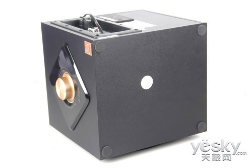 低音炮如果以音量旋钮为正面,那么倒相孔设置在背部,连线接口等设置在侧面。当然这种布局是根据声学原理来设计的,不过相对于用户的摆位似乎不太方便。习惯上大家把低音炮放在桌面下,基本上都会靠墙,后置倒相孔容易贴近墙壁,对空气的对流稍有影响。