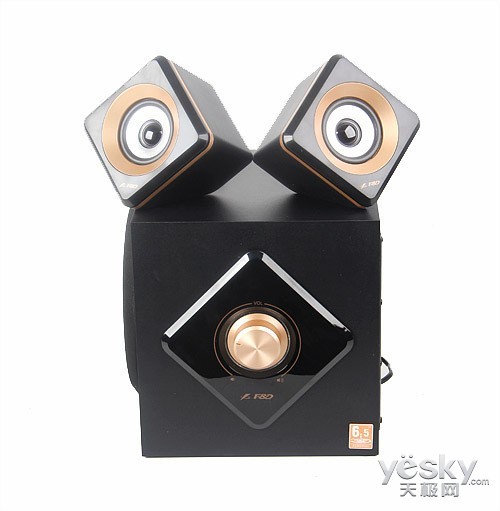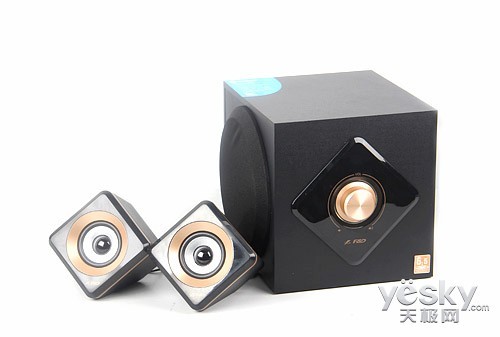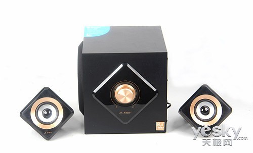低音炮和卫星箱均采用菱形与方形的组合,两者相互呼应、浑然一体,将产品的整体风格完美呈现出来。两个卫星箱菱形立方体的造型尤为突出,空间感突出,形如一座立体艺术雕塑般屹立。箱体沉稳黑色主色调辅以灿烂的金色加以润色,低调不张扬又透露奢华美感。低音炮和卫星箱前面板都采用了镜面高光效果,剔除毛躁感显得光滑平整。