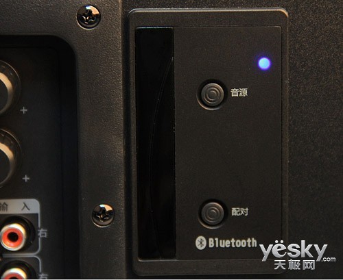 两颗小旋钮分别为高音增益、低音增益调节。旁边为蓝牙配对按键以及操作简介。