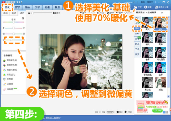 4、最后返回“美化”菜单,选择“基础”分类,使用透明度为70%的“暖化”特效,接着点击“调色”特效,拖动滑块调整色调为偏黄,就大功告成啦!