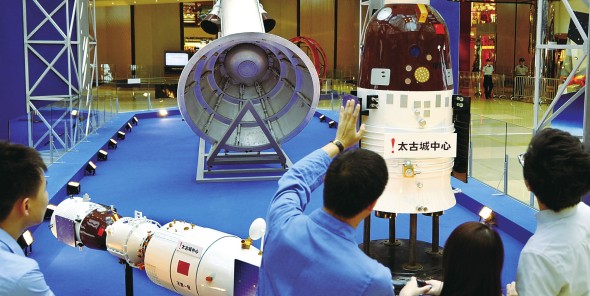 为期一个月的中国航天科技展将于28日在香港开幕。此次展览包括31件实物和模型,其中火箭逃逸塔实物、飞船搭载的中国国旗实物,以及返回舱降落伞等实物都是首次在港展出。图为27日媒体记者在预展上采访。