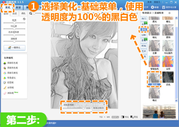 2、继续在“美化”菜单下,选择“基础”分类,使用透明度为100%的“黑白色”。