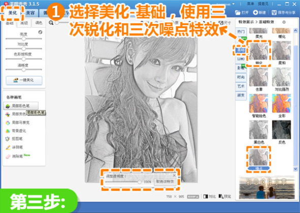 3、然后再选择“基础”分类,使用三次的“锐化”和三次的“噪点”特效,就能提升线条和笔触的逼真度,就大功告成啦!