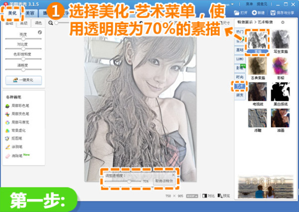 1、在“美图秀秀”软件下打开待处理的照片,进入“美化”菜单,选择“艺术”分类,使用透明度为70%的“素描”,虽然一键简单变换素描,但是根据每张照片的不同要适当选择透明度。