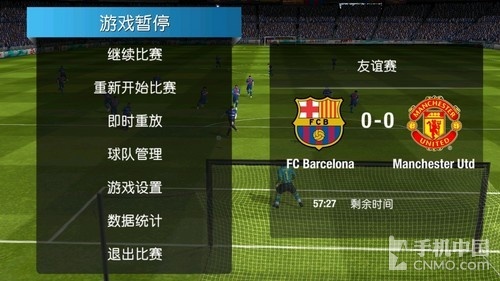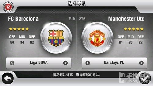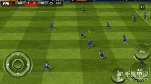 笔者用的是西甲强队巴塞罗那,而对手则是英超劲旅曼联。从整体效果来看,本游戏的做工十分精细,而且在操作习惯方面继承了PC端游戏的风格,很容易上手。在屏幕左边有个虚拟摇杆,可以控制人物的跑动,右边为功能键,带球时分别为传球,射门,加速过人。无球时则是切换、冲刺抢断和铲球。