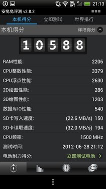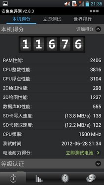 对比完硬件,更要通过工具来测试一下到底谁更强了。从上图我们能够直观的看出,LG P880比One X整整多跑了1000多分,虽然跑分工具不能绝对的比较出两款手机的具体性能,但也从侧面反映出一些问题。同样是采用一样频率一样型号的处理器,CPU整数性能和浮点性能都差了一截,这也说明了LG这款新机相比老机型One X而言,硬件方面是做了一些优化的。其实除了CPU,其他方面的性能都相差无几。所以说,光看硬件太肤浅,还需要看谁优化的好。