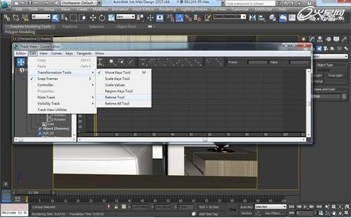 Retime Tool工具更有助于掌握时间轴,可以实时对动画速度进行重新调整,非常方便;若要使用此工具,可以在“Track View-Curve Editor”高亮显示轨迹以复位时。启动该工具之后,在“Track View-Curve Editor”窗口中双击以放置复位时标记。每对相邻的垂直标记包括在高亮显示的轨迹上,在这对标记之间的时间,然后可以移动这对标记来更改动画计时。如 果使这对标记靠近,其内的动画会加快;如果使这对标记远离,则动画会减慢。