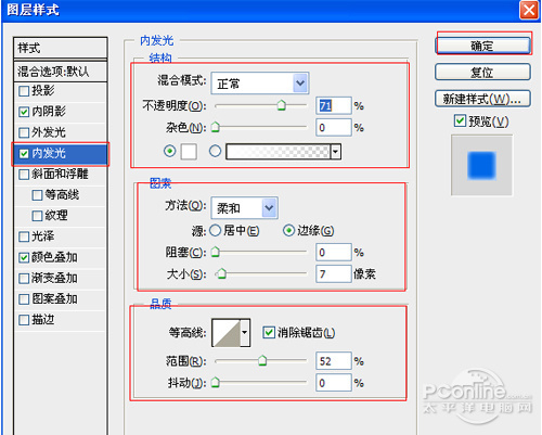 5、勾选内发光选项,设置投影混合模式:正常,不透明度:71%,杂色:0%,点击点按可编辑渐变,设置前景到透明,颜色为白色,方法为柔和,源:边缘,阻塞:0%,大小为:7像素,范围为52%,如图5所示。