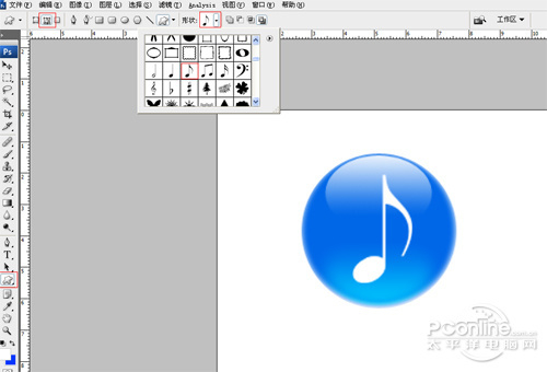 11、在图层面板上单击创建新图层按钮 ,新建一个图层5,选择工具箱中的自定义形状工具,在工具选项栏中设置为路径模式、形状列表中选择“音乐符号”形状,按住Shift键不放用鼠标左键在绘 图区拖出“音乐符号”形状,接着按快捷键Ctrl+Enter将形状转换为选区。设置前景色为白色,按快捷键Alt+Delete填充颜色,如图11所 示。