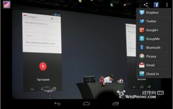 Jelly Bean深度整合各种社交媒体,在其Gallery应用中用户可以直接同第三方应用来共享数据。简而言之,用户在 Android Gallery中的图片既可以在Facebook、Twitter和Google+这样的平台上共享,也可以直接在GroupMe、 Dropbox和Foursquare等应用上共享。用户通过下拉菜单中的共享键就可以将内容共享至任何地方。