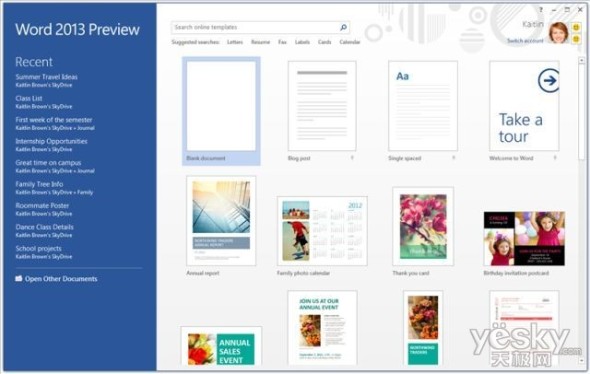 当我们启动Word时,Word会告诉用户最近访问这台计算机上的或任何其他连接设备的文件列表。Office 2013可漫游跨设备提供更多的模版,用户还可以在界面上固定好自己喜欢的模板。